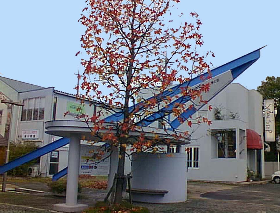 ポンプ小屋の横に看板を設置し、楕円の屋根をつけて、その上にモニュメントをつくりました。